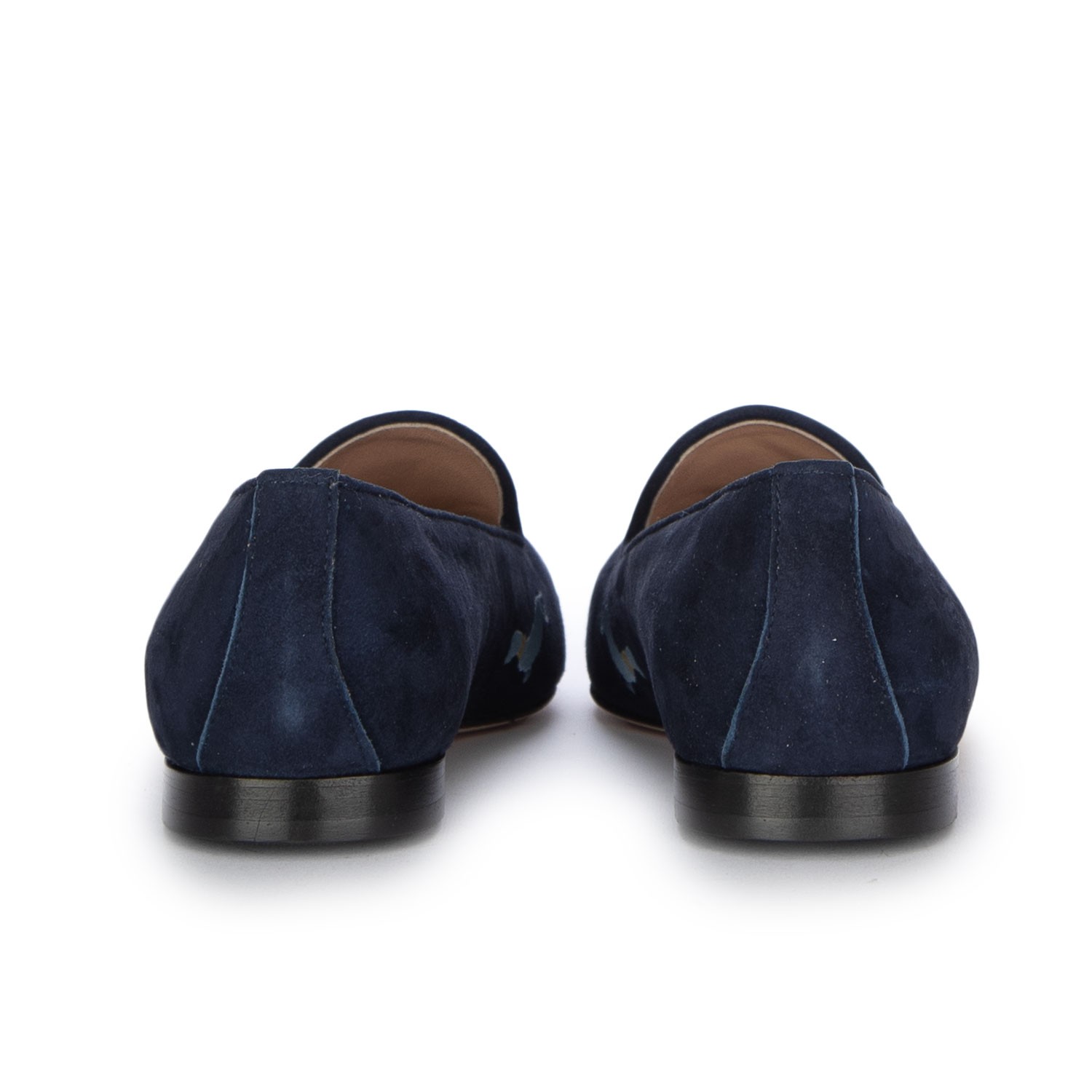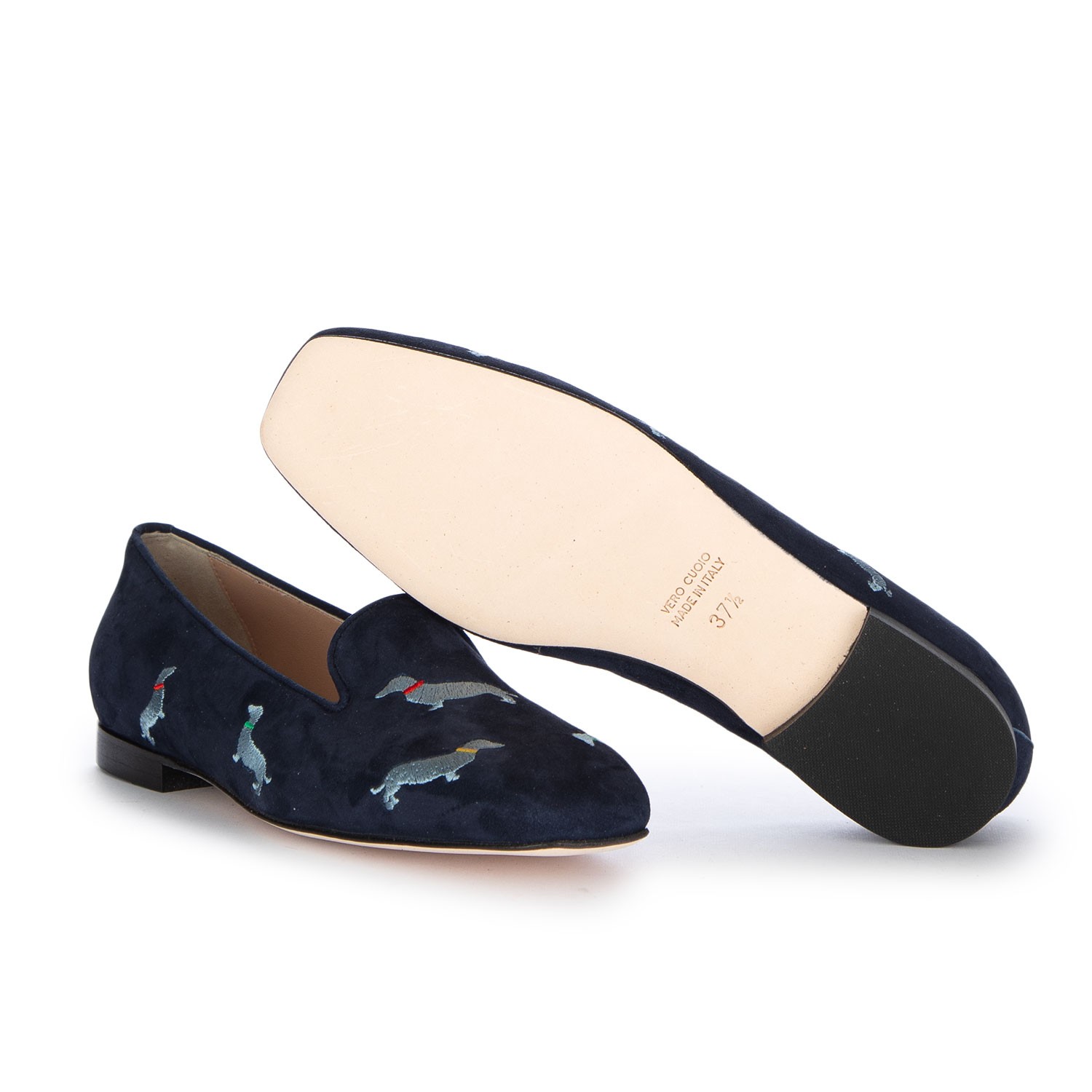Roma Slipper im raffinierten und eleganten Stil, mit schlanker Silhouette und Obermaterial mit ikonischer Stickerei. Aus weichem Veloursleder gefertigt, sorgfältig handgearbeitet und verarbeitet. Handmade in Italy.