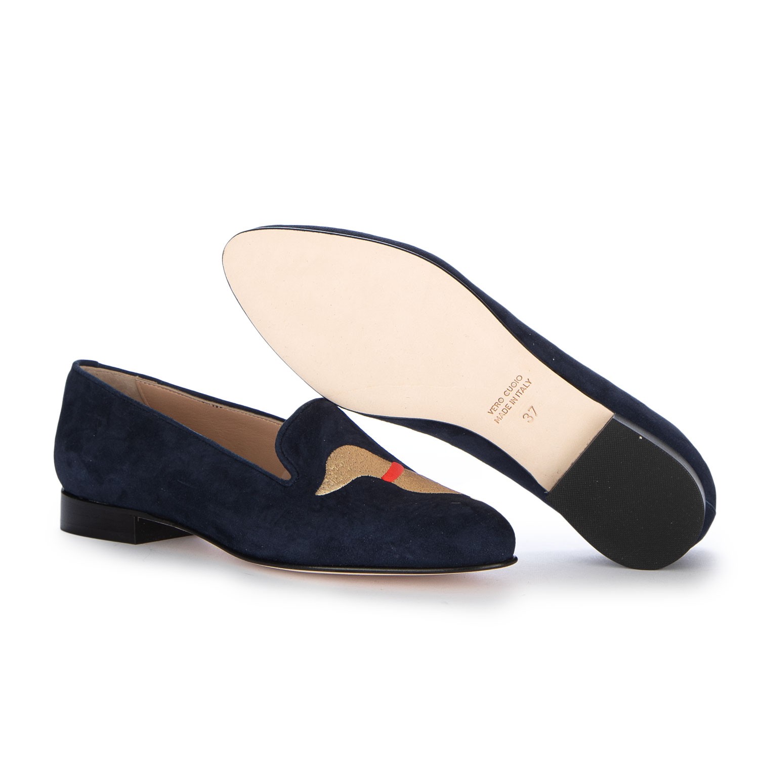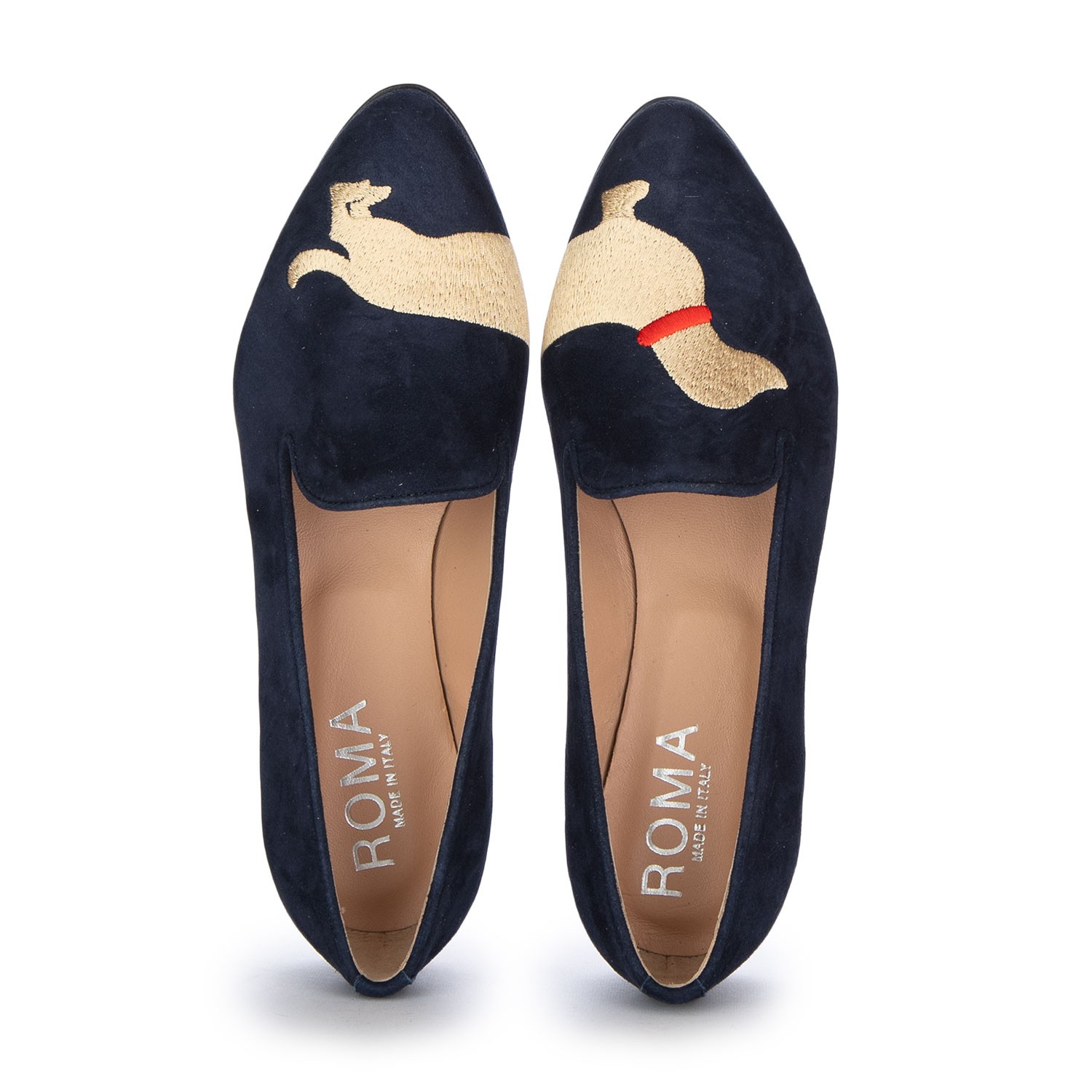 Roma Slipper im eleganten und unverwechselbaren Stil, mit schlanker Silhouette und Obermaterial mit ikonischer Dackel-Stickerei. Aus weichem Veloursleder gefertigt, sorgfältig handgearbeitet und verarbeitet. Handmade in Italy.