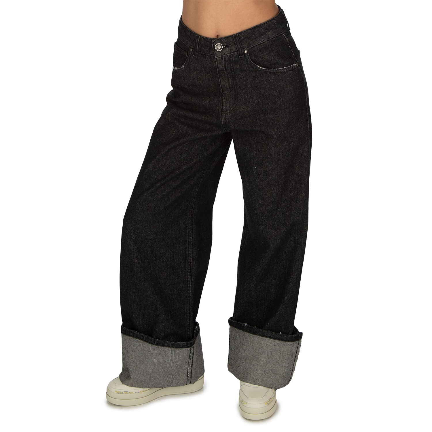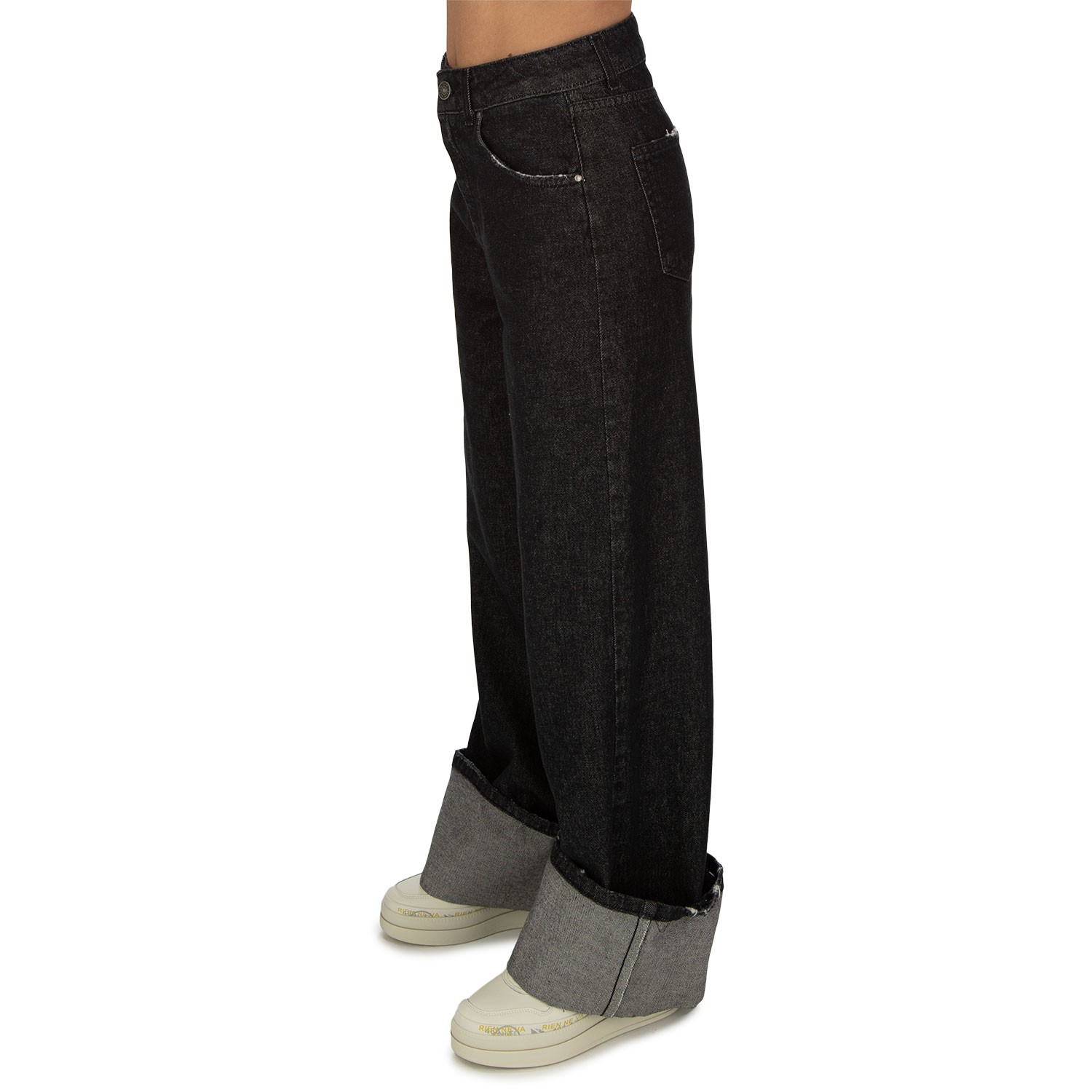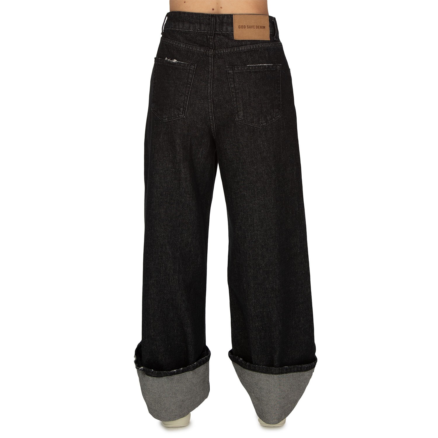 God Save Denim Jeans im modernen und markanten Stil mit weiter Passform, mittlerer Taille und umgeschlagenem Saum. Hergestellt aus schwarzem Baumwoll-Denim mit tonalen Nähten und ausgefransten Details für einen Used-Effekt. Made in Italy.