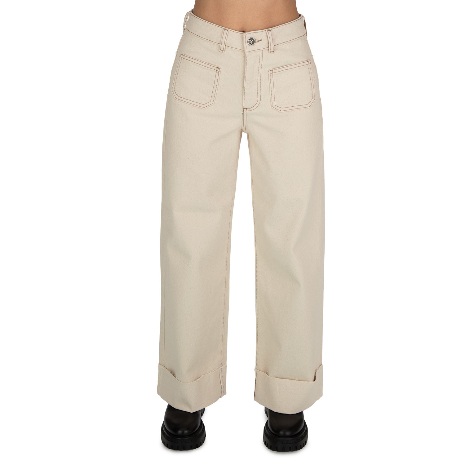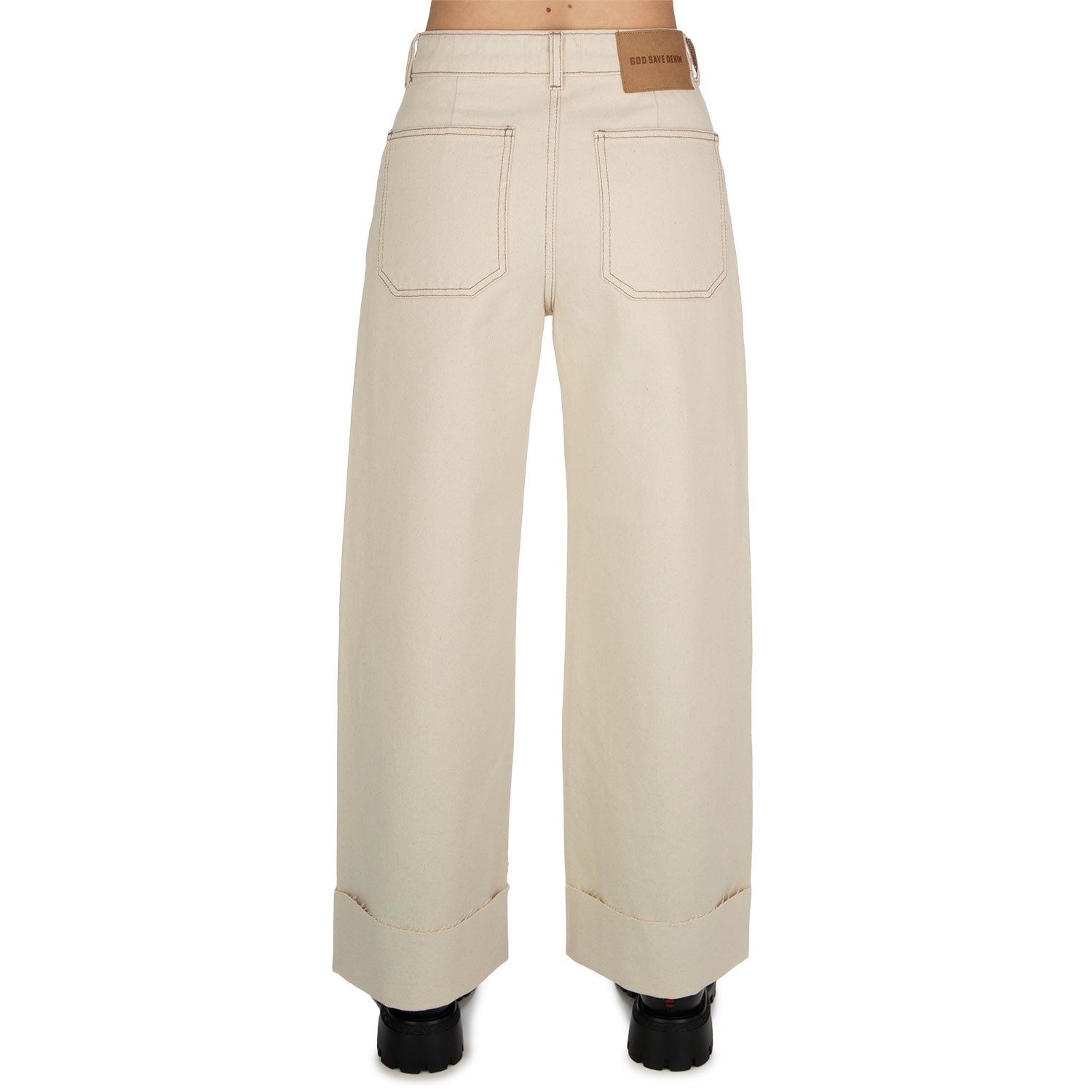 God Save Denim Jeans im minimalistischen und modernen Stil mit weitem Bein, mittlerer Taille und umgeschlagenem Saum. Aus cremefarbenem Baumwolldenim mit Kontrastnähten und handwerklichen Details gefertigt. Made in Italy.
