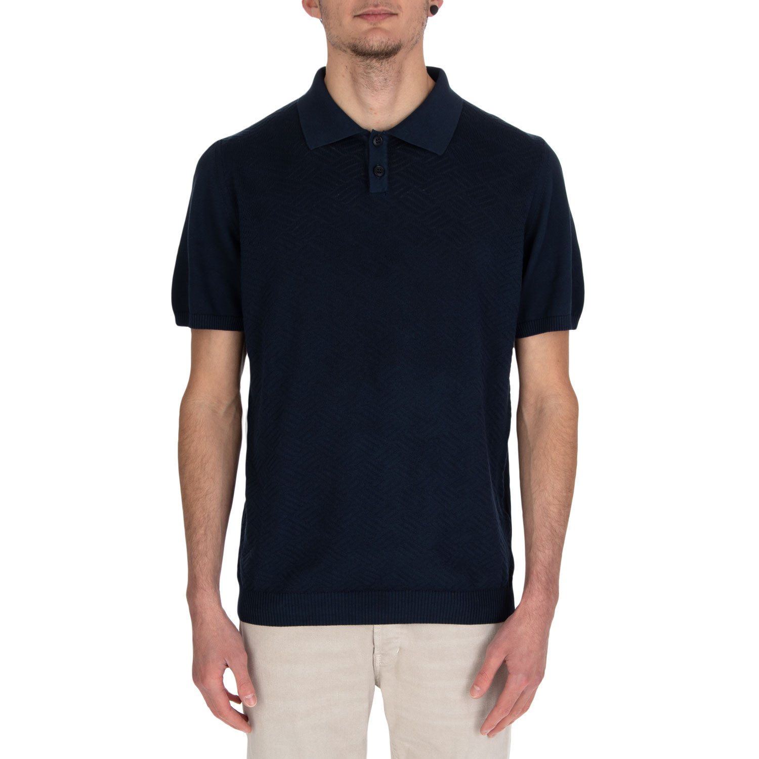 Wool & Co Herren-Polohemd im lässigen Stil. Aus 100 % nachtblauer Baumwolle, mit kurzen Ärmeln und geometrischem Muster auf der Vorderseite. Kragen und zwei Knöpfe in Ton. Leicht und atmungsaktiv, perfekt für heiße Tage. Made in Italy.
