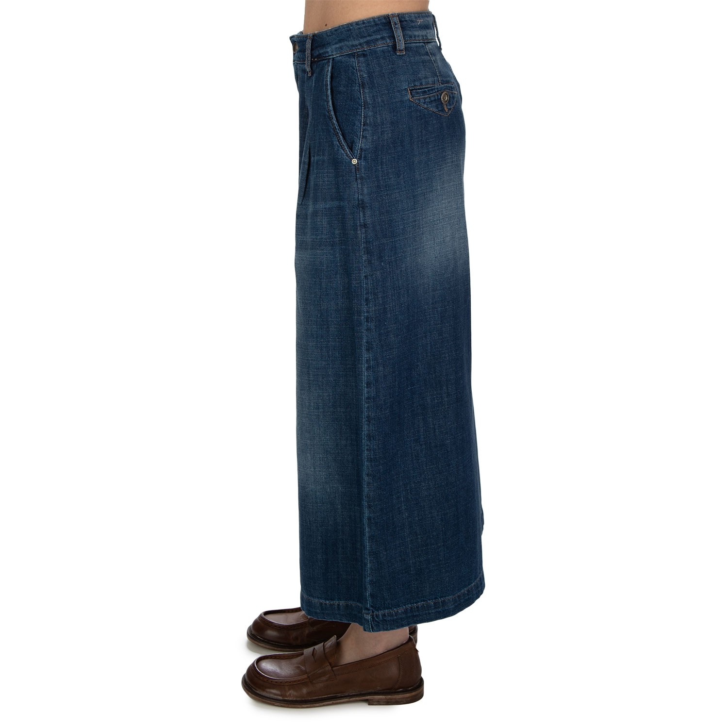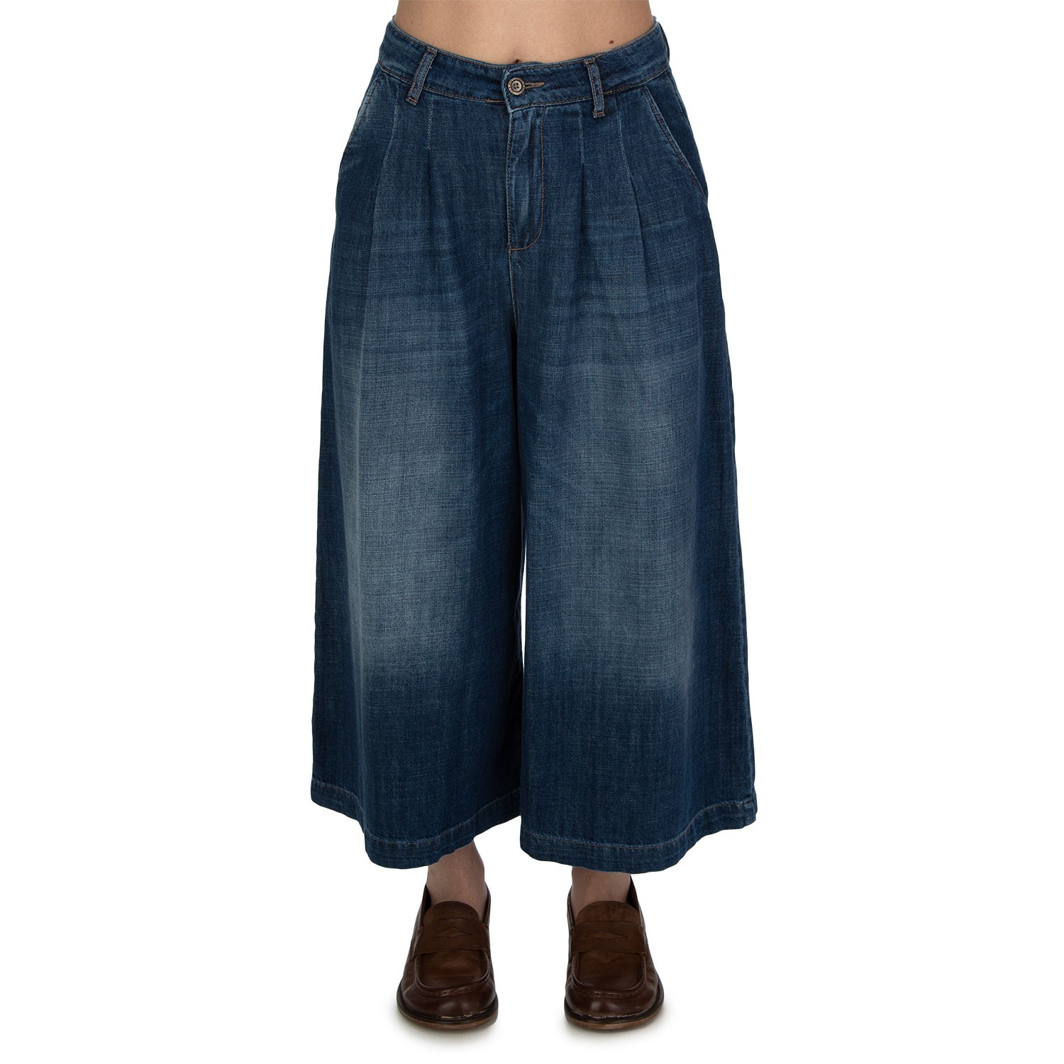 Noir ‘n’ Bleu Culotte-Hose im modernen Casual-Stil, mit weitem Bein, normaler Bundhöhe und Seitentaschen. Aus weichem Denim gefertigt, bietet sie Komfort und eine fließende Passform. Sorgfältig verarbeitet, made in Italy.