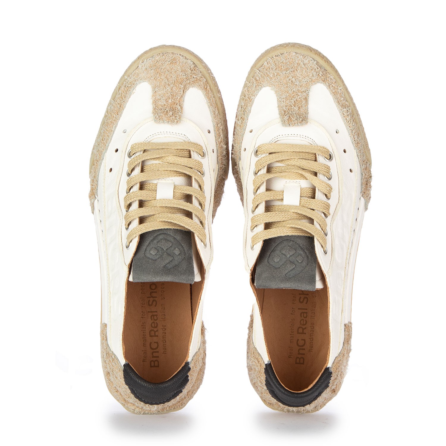 Sneaker von Bng Real Shoes im modernen, lässigen Stil mit klaren Linien. Gefertigt aus weichem Leder mit Suede-Einsätzen, Frontschnürung und atmungsaktivem Innenfutter aus Naturleder. Herausnehmbare Memory-Foam-Innensohle und gefräste Naturgummisohle. Handmade in Italy.