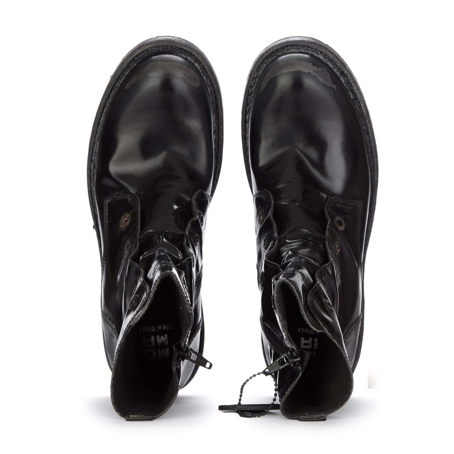 Chelsea boots by Moma in an elegant style. Crafted from glossy black leather, they feature an eight-eyelet lace-up design but without laces and a durable rubber sole with a robust tread. The worn details give these boots a vintage and authentic look. Handmade in Italy.
