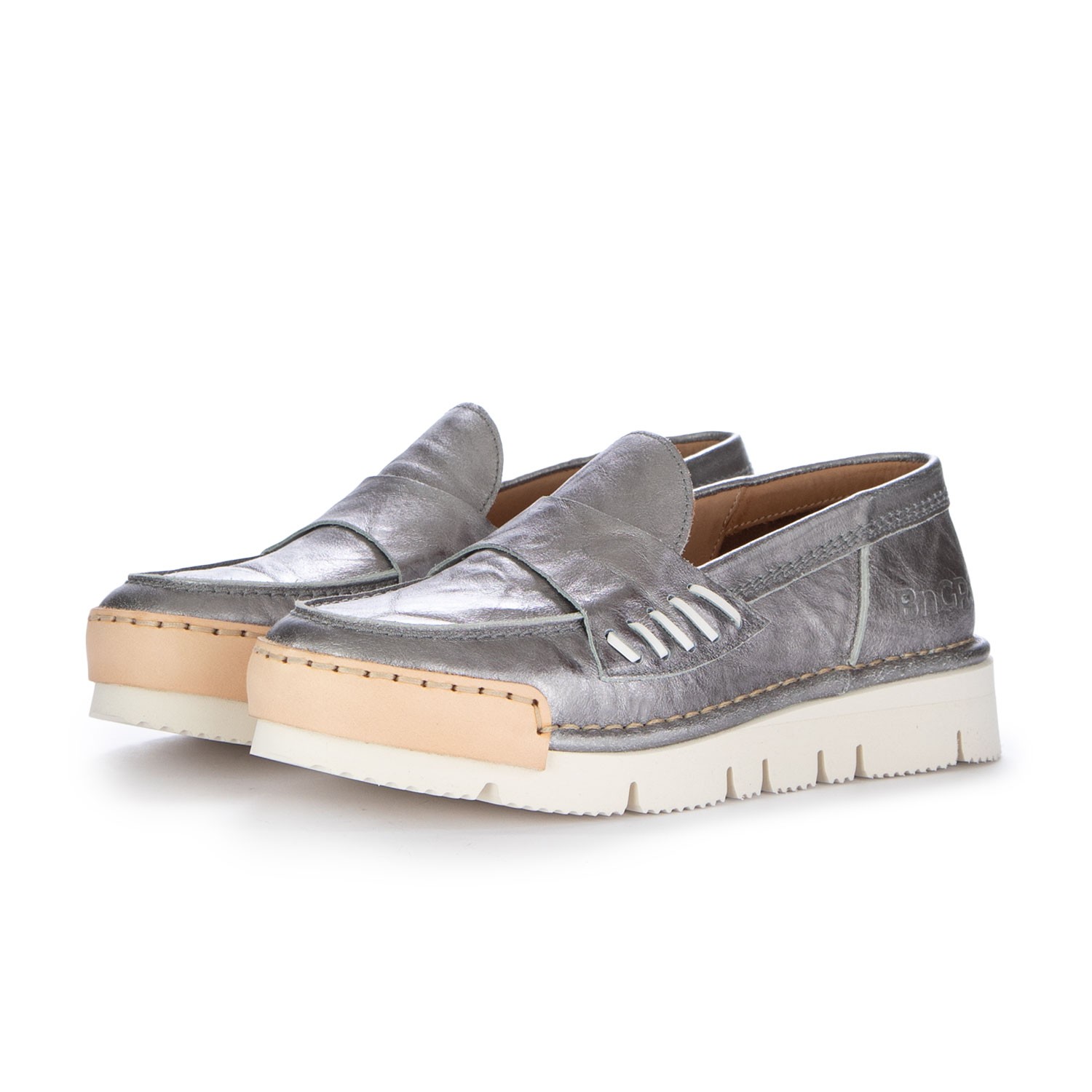 Bng Real Shoes loafers, featuring an original and contemporary design. Made of metallic-effect leather, they have a serrated sole for comfort and stability. The artisanal craftsmanship enhances the product's quality, perfect for casual and modern looks. Handmade in Italy.