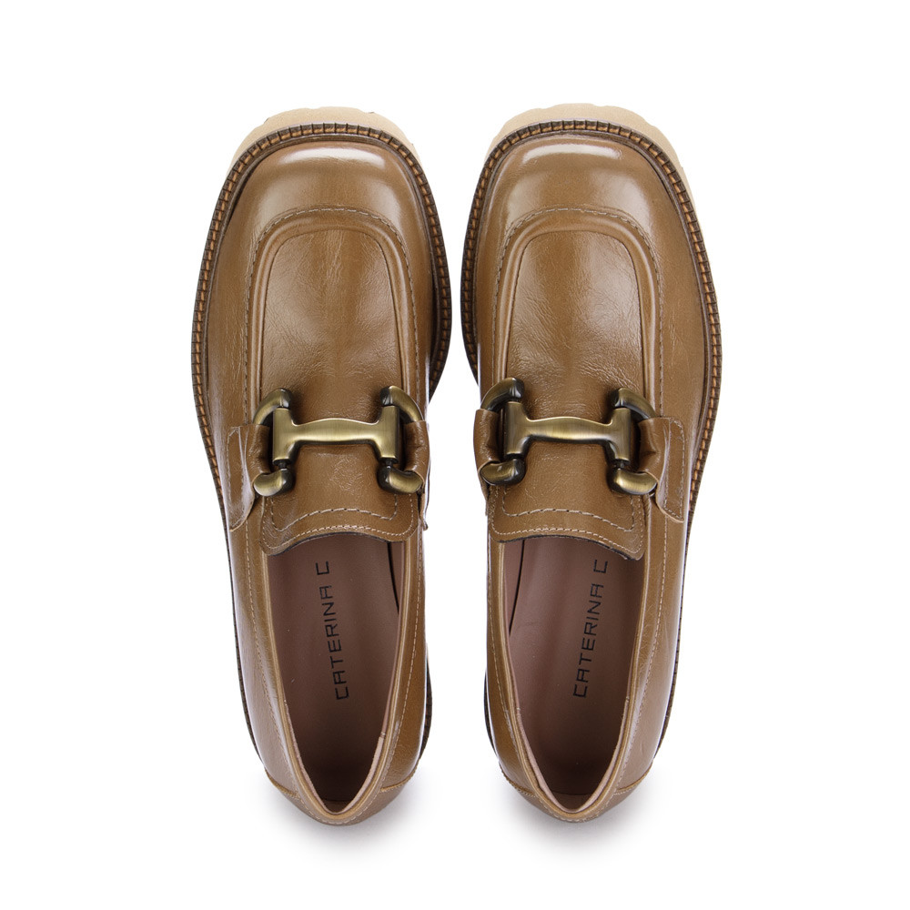 Caterina C - Mod: 2264 50 SUGHERO - Women's flat shoes with brown shiny leather tops, Enriched with metal stirrup on the instep and with visible stitching, Lined in leather, with leather insole and rubber sole. Original and elegant at the same time. Made in Italy.
