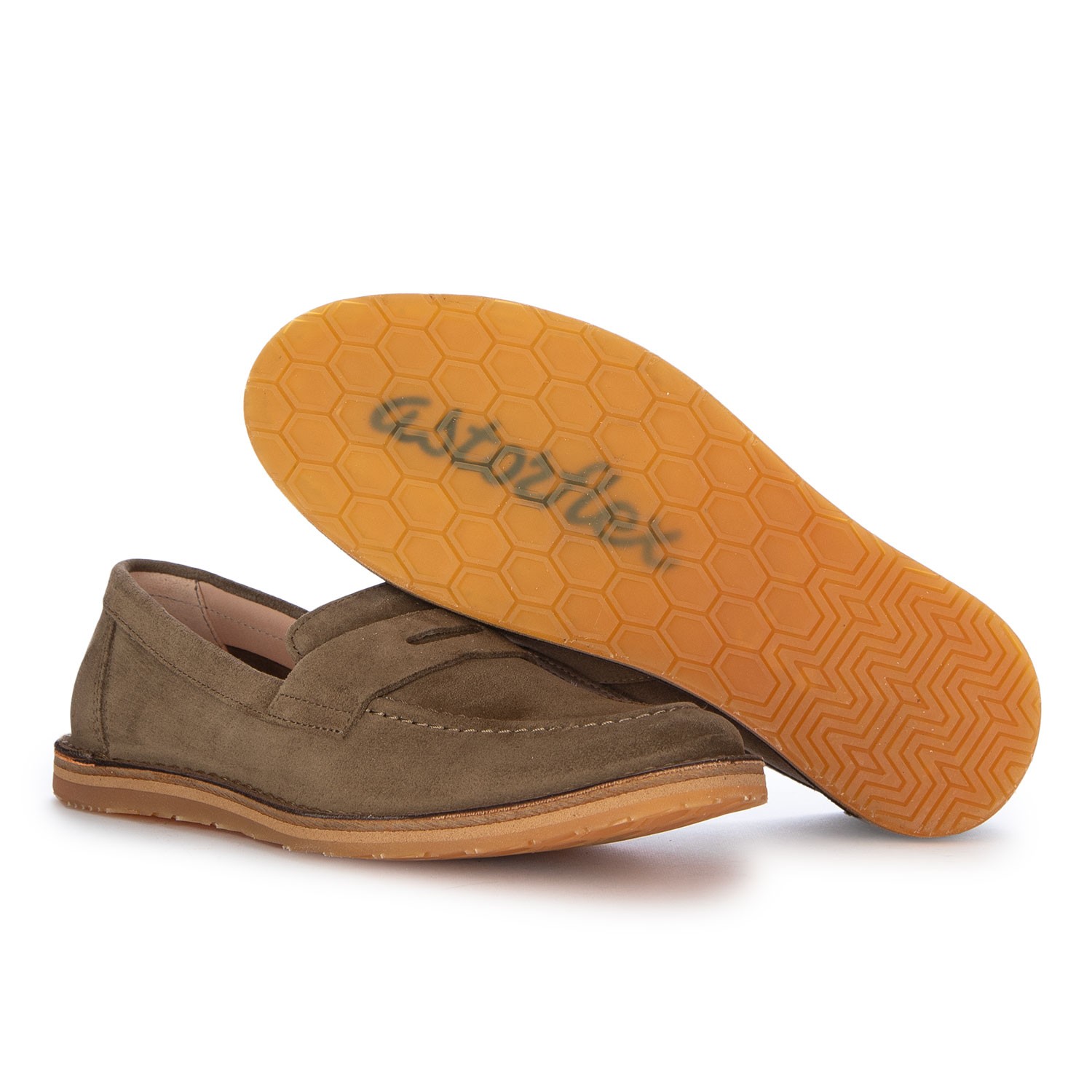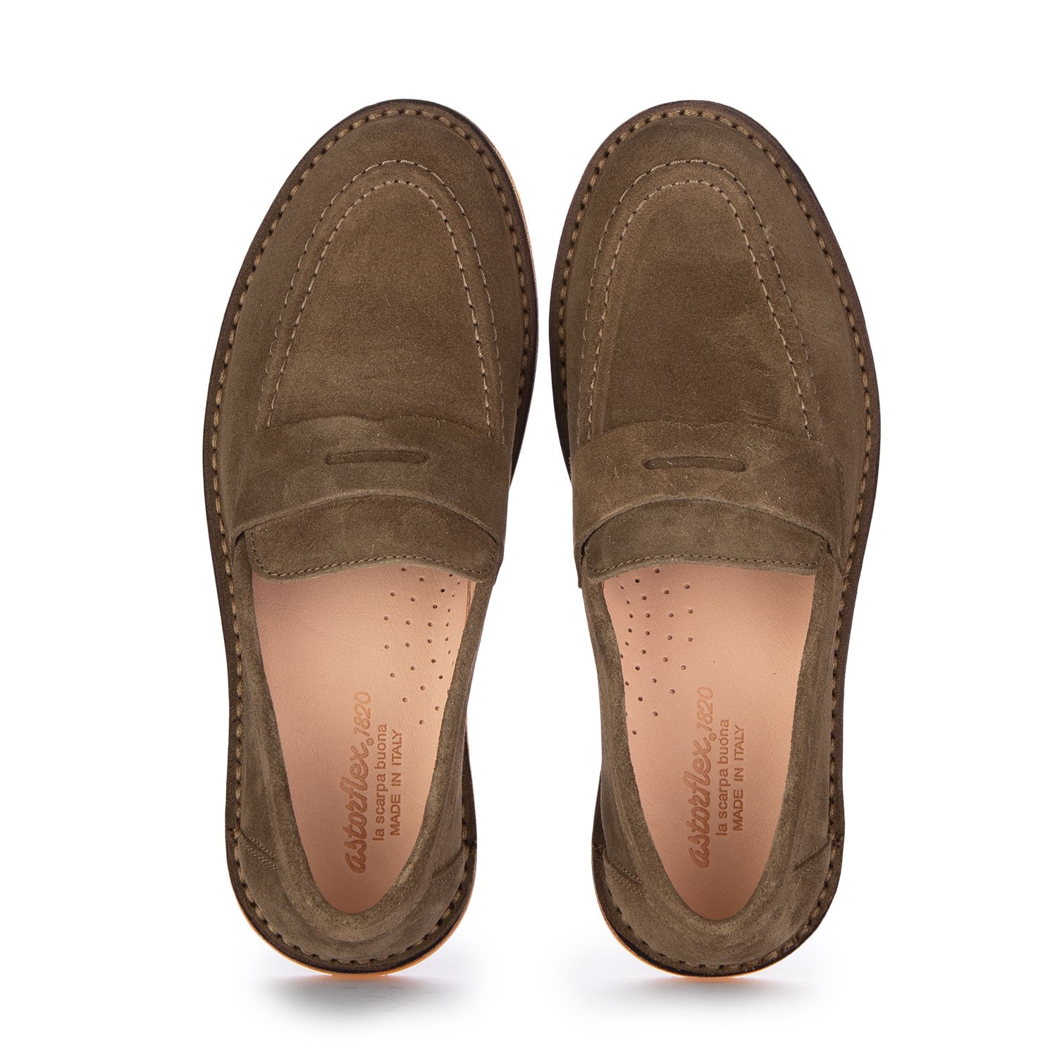 Astorflex loafer with a refined casual style, featuring a classic design with penny strap and visible stitching. Crafted from soft suede leather, expertly handmade for comfort and quality. Made in Italy.