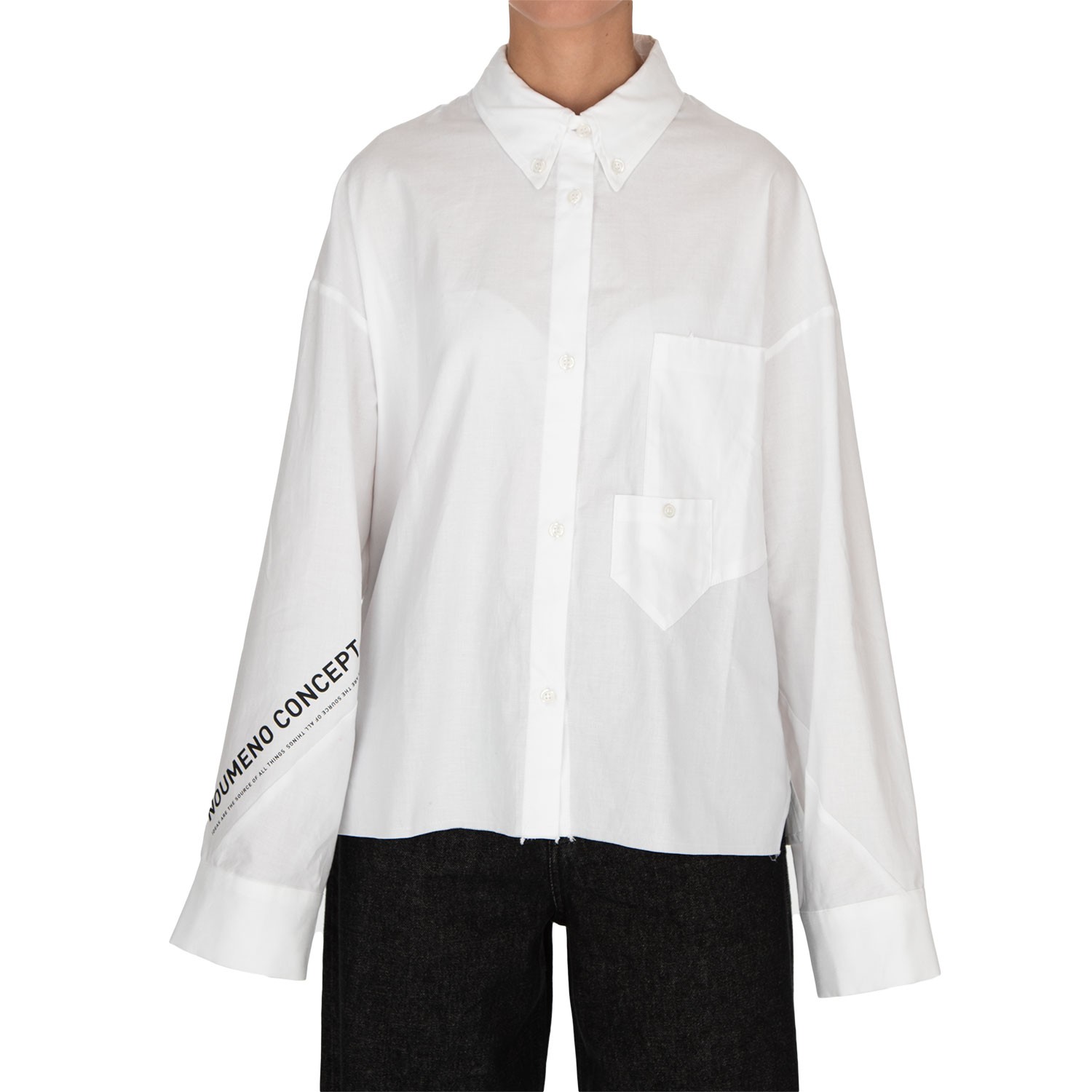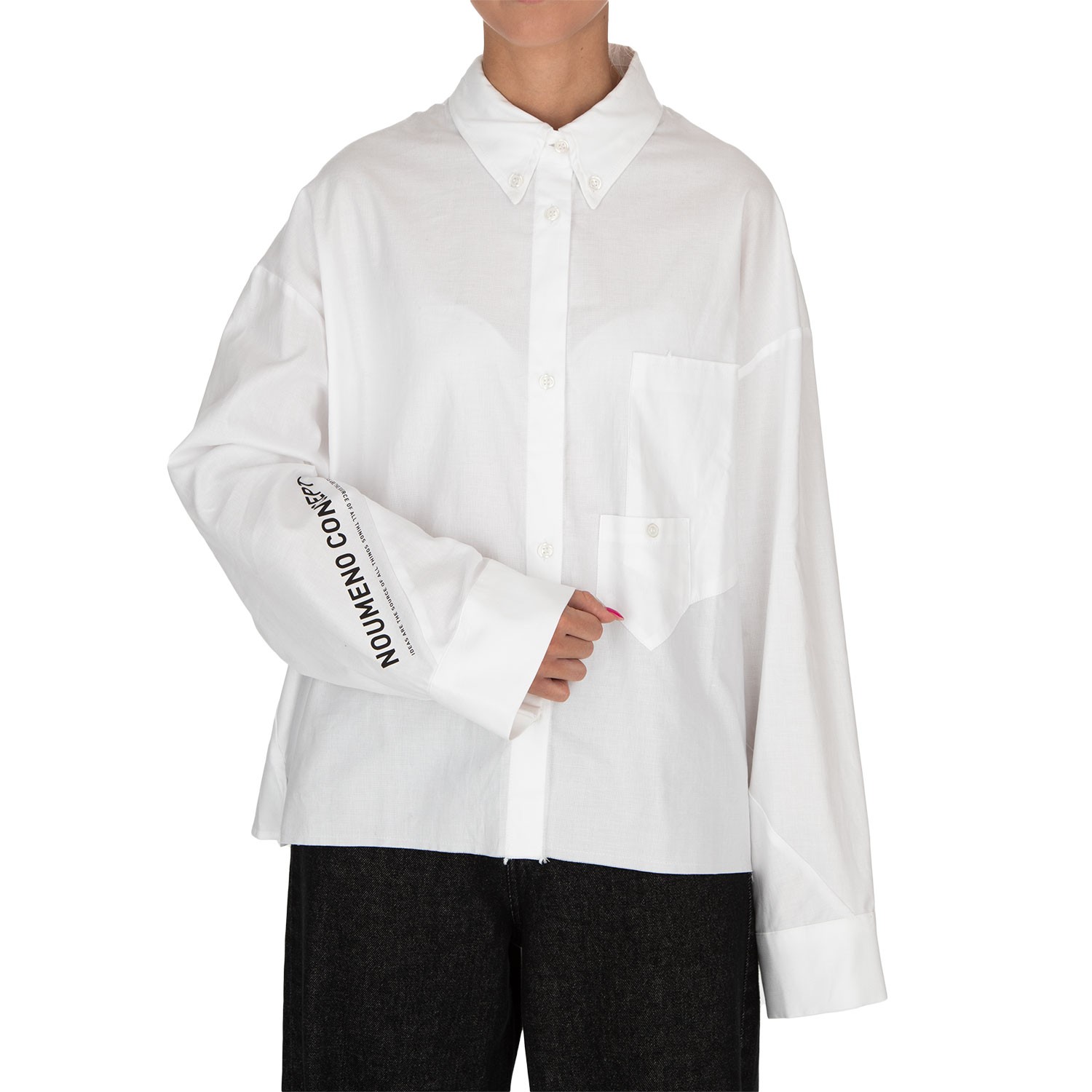 Noumeno Concept shirt with a modern and minimalist style, featuring an oversized fit with button-down collar, front pocket, and logo print on the sleeve. Made from pure lightweight cotton with poplin craftsmanship for a fresh and comfortable fit. Made in Italy.