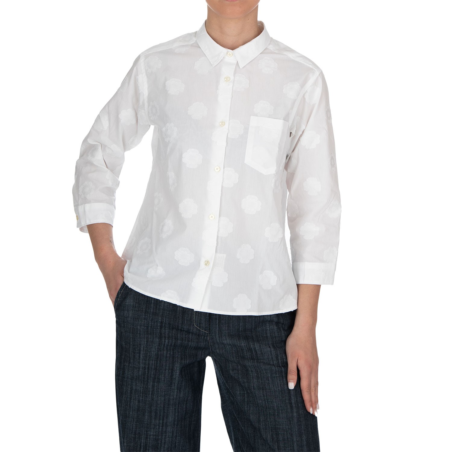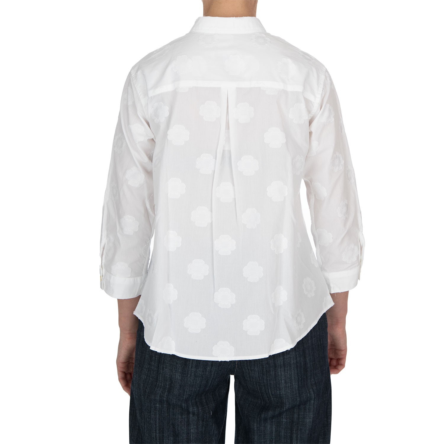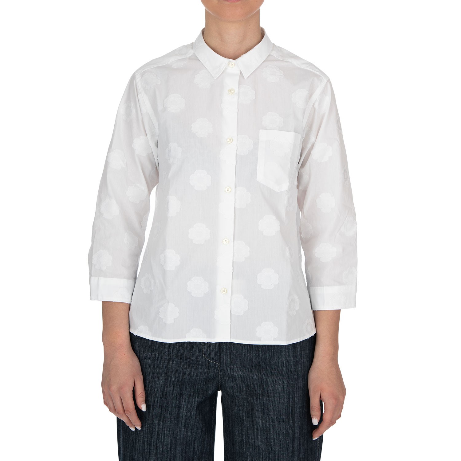 Liberty Rose shirt with a romantic and contemporary style, featuring a soft silhouette with 3/4 sleeves, classic collar and patch pocket. Made from lightweight cotton with floral jacquard texture, with refined finishes. Made in Italy.