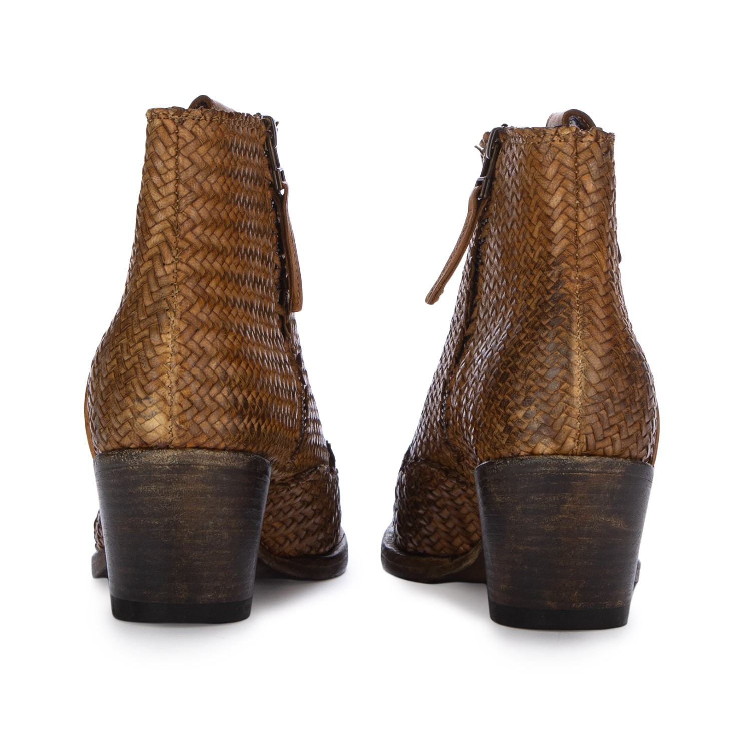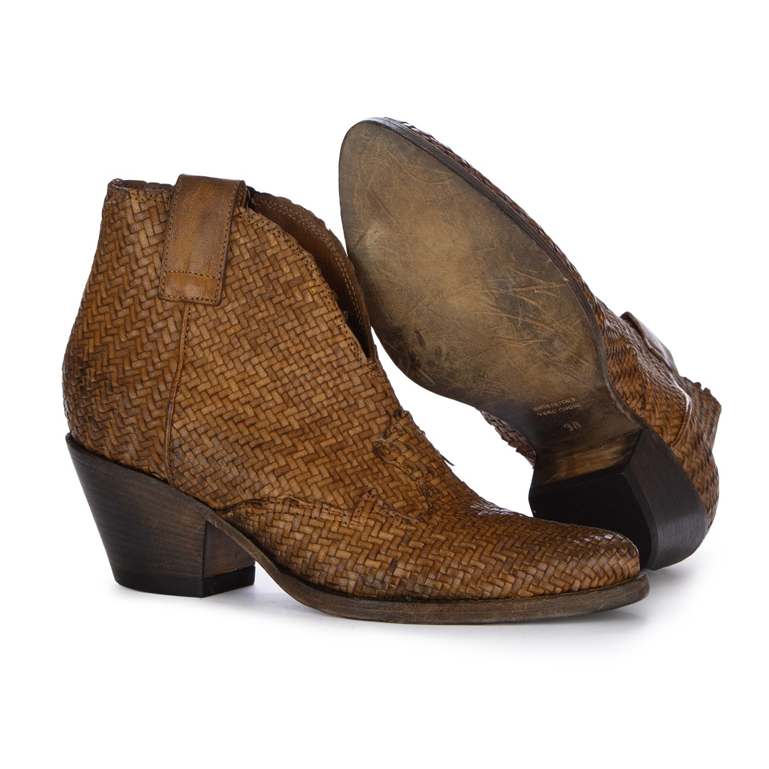 Keep Texan ankle boots with a western design and artisanal charm. Made from fine woven leather, they feature a pointed toe, side zippers, and a comfortable mid-height heel. The handcrafted process ensures uniqueness and durability. Handmade in Italy, perfect for casual-chic looks.