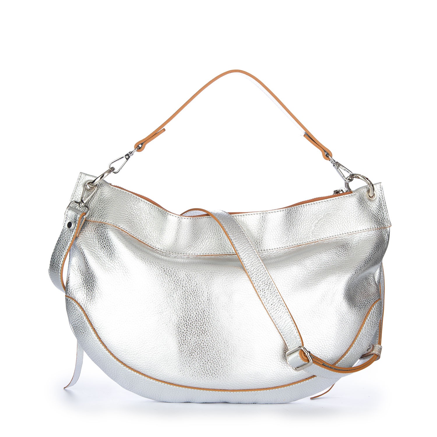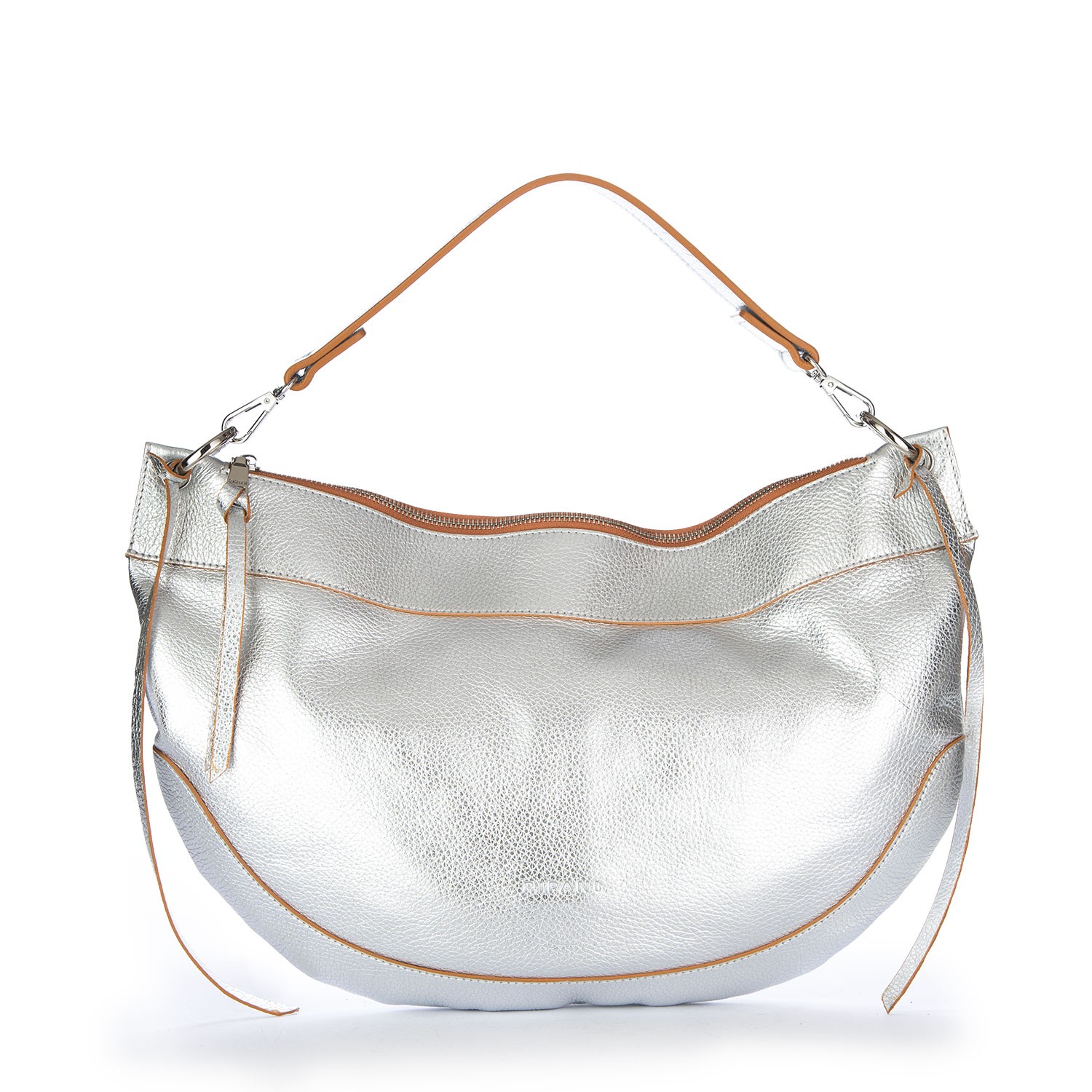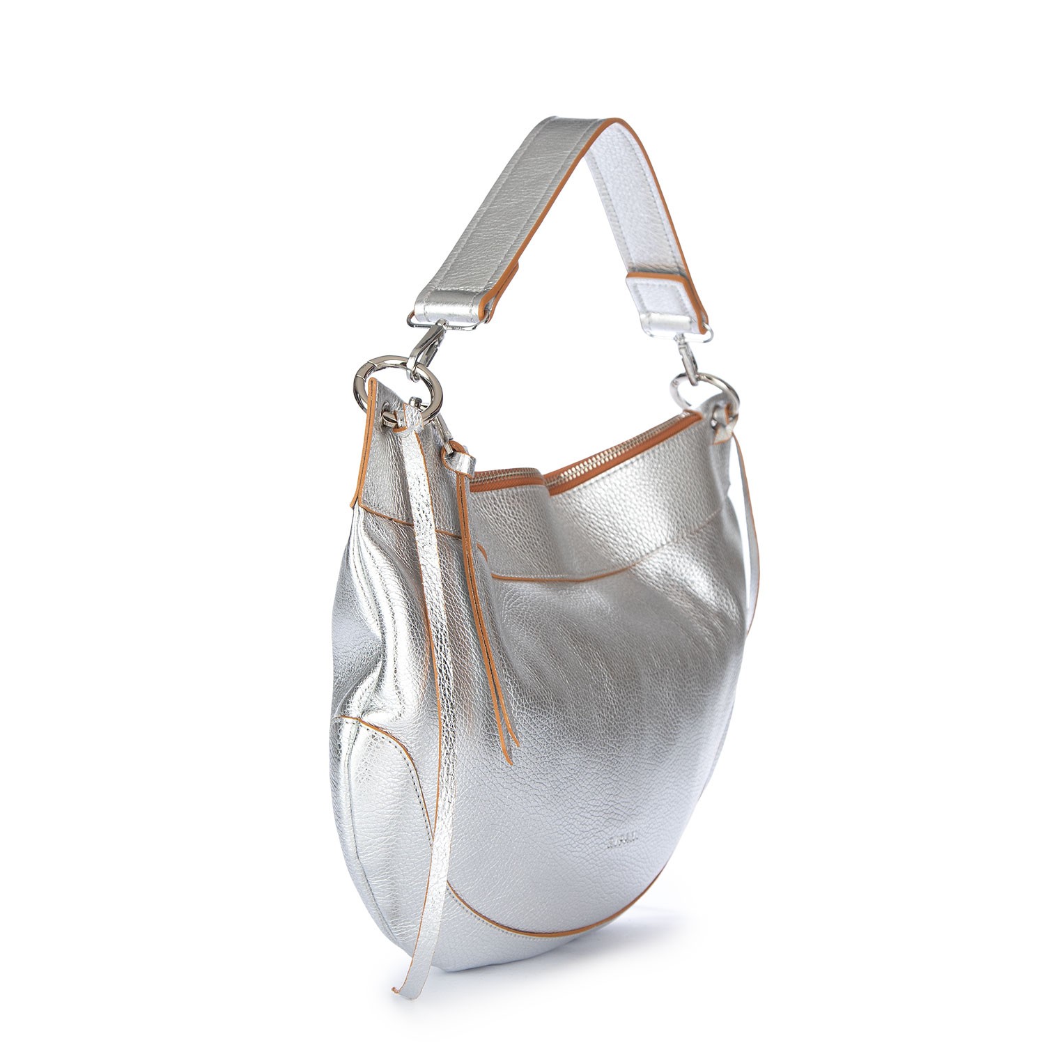 Borsa a spalla Ripani dallo stile contemporaneo e luminoso, caratterizzata da linee morbide e design essenziale. Dotata di manico e tracolla regolabile, con chiusura a zip. Realizzata in pelle martellata metallizzata, con lavorazione artigianale. Fatta a mano in Italia.