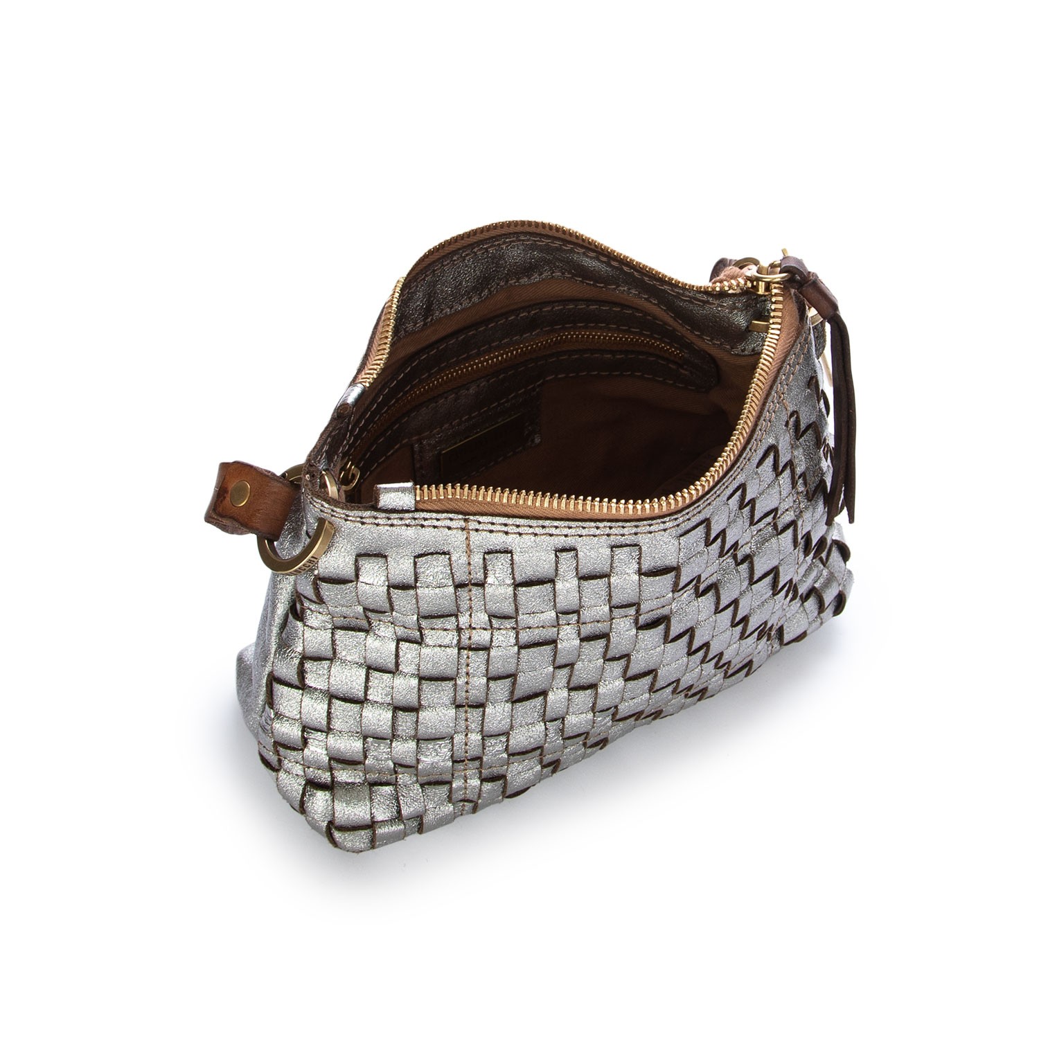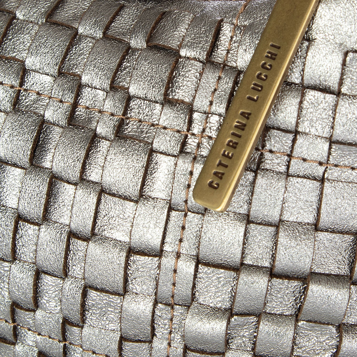 Borsa a spalla Caterina Lucchi dallo stile contemporaneo e luminoso, caratterizzata da intreccio artigianale e finitura laminata. Realizzata in pelle di vitello con dettagli in vacchetta tinta in capo, unisce eleganza e praticità. Lavorazione artigianale. Made in Italy.