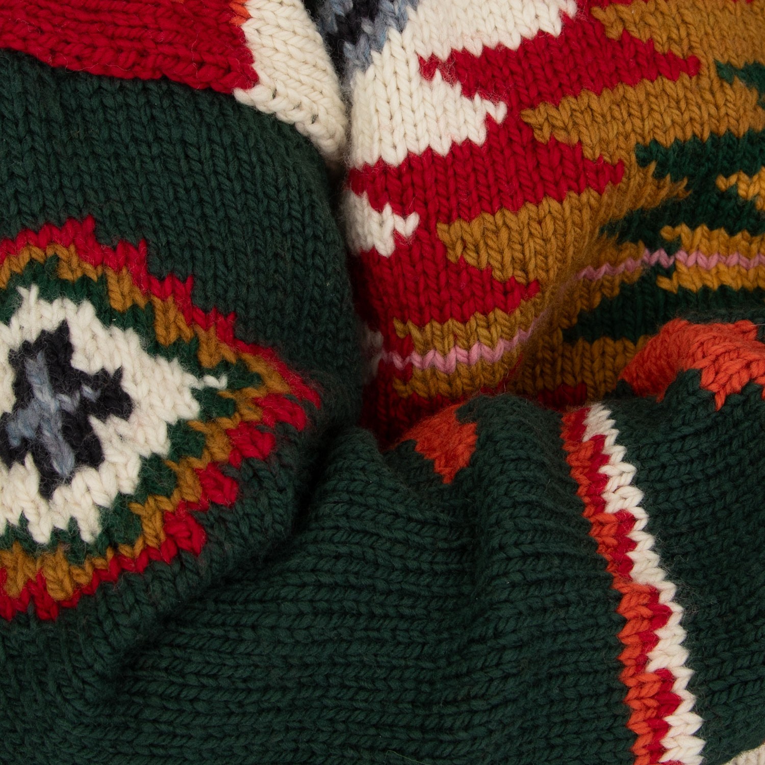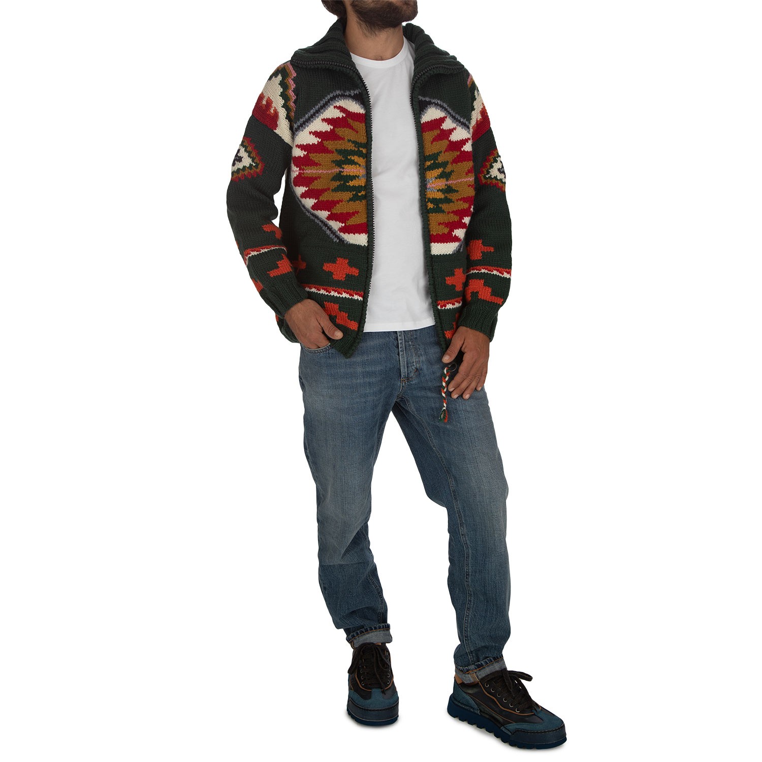 Cardigan Frantic dal design etnico e dallo stile boho contemporaneo, caratterizzato da vivaci motivi geometrici jacquard e zip frontale. Realizzato in morbida lana, offre calore e comfort. Interamente fatto a mano in Ecuador da artigiani locali, secondo un esclusivo design italiano.
