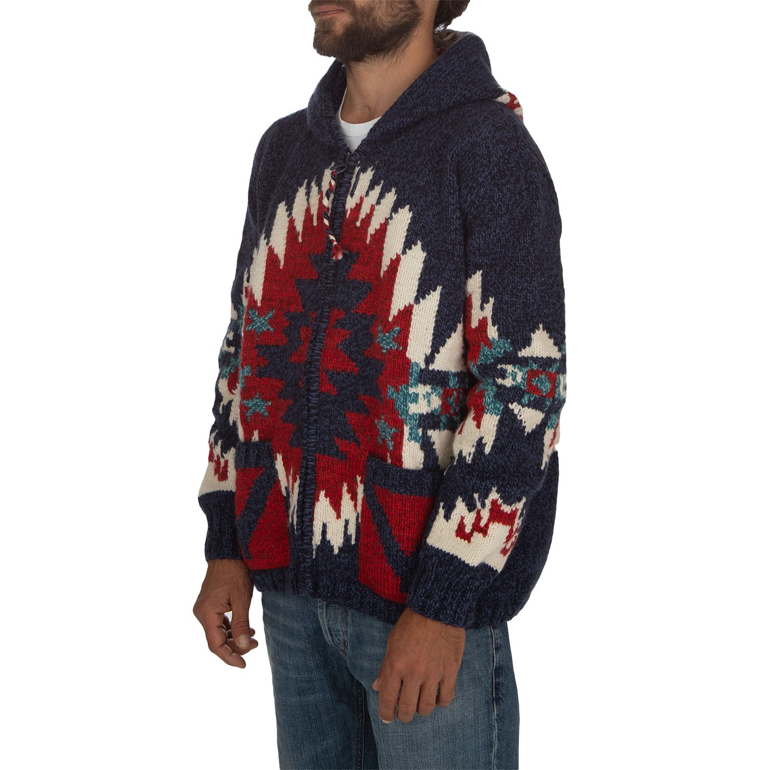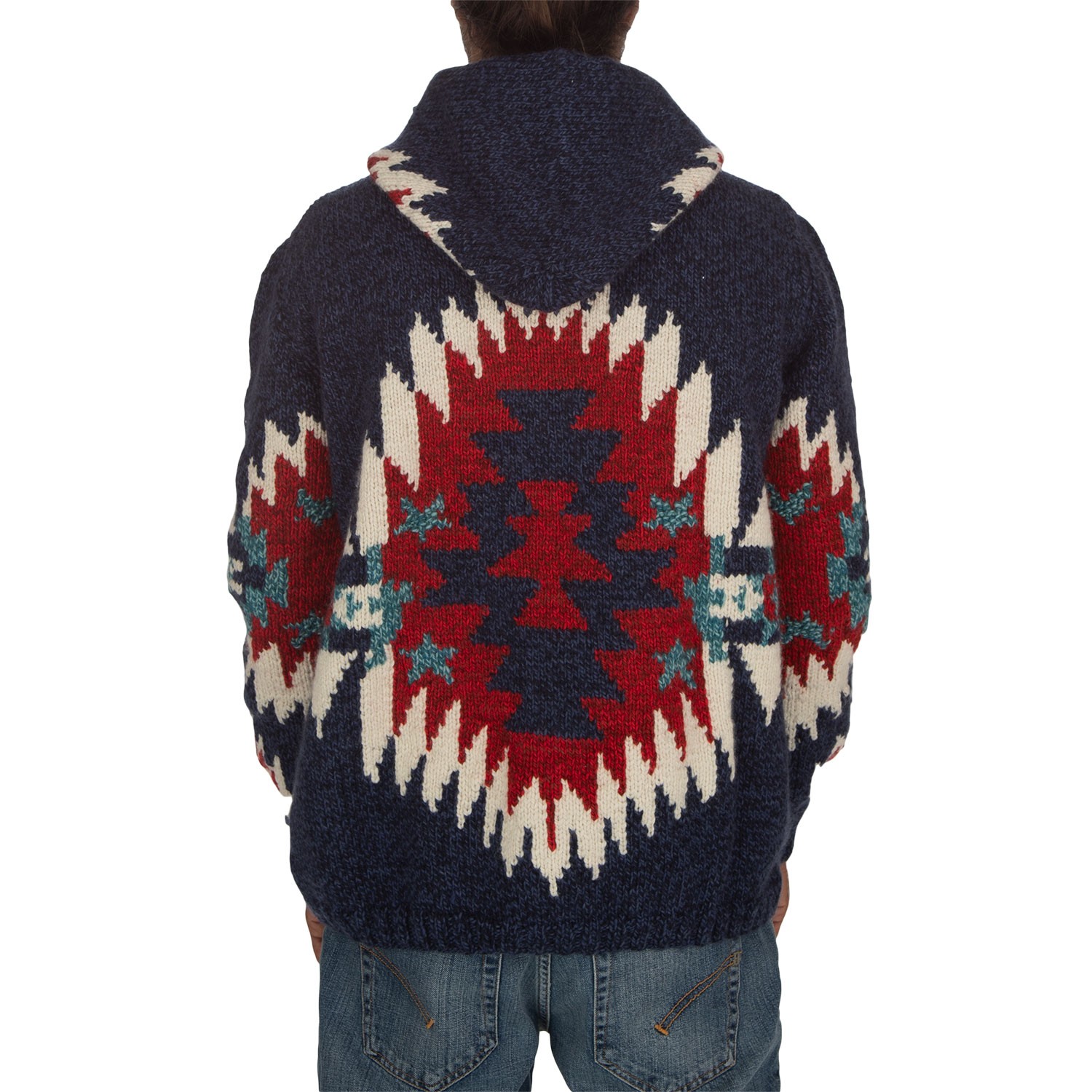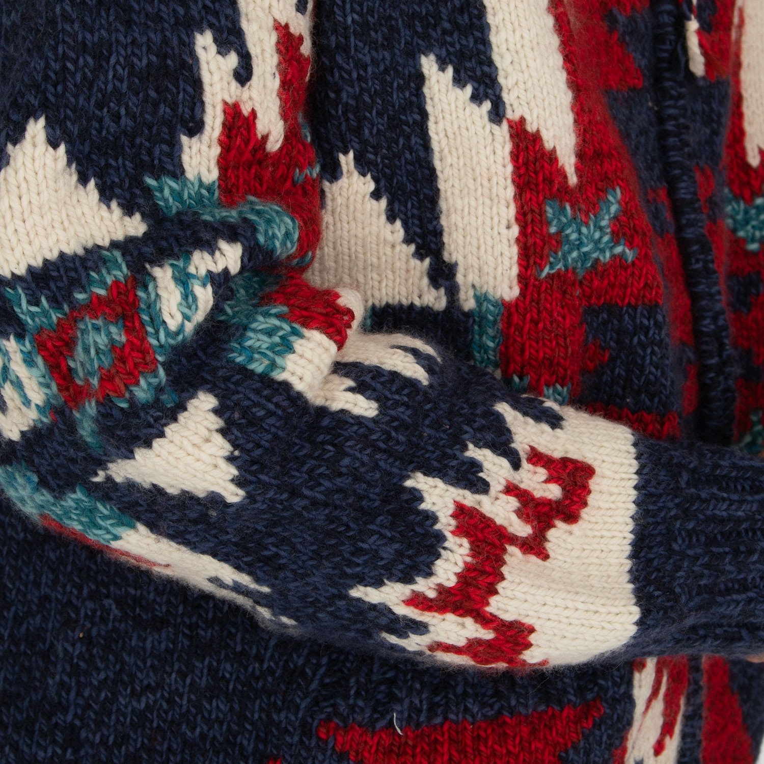 Cardigan Frantic dal design etnico e dal fascino boho, con cappuccio e zip frontale. Caratterizzato da vivaci motivi geometrici jacquard nei toni del blu e del rosso, è realizzato in morbida lana. Lavorato a mano in Ecuador da artigiani locali, segue un esclusivo design italiano.