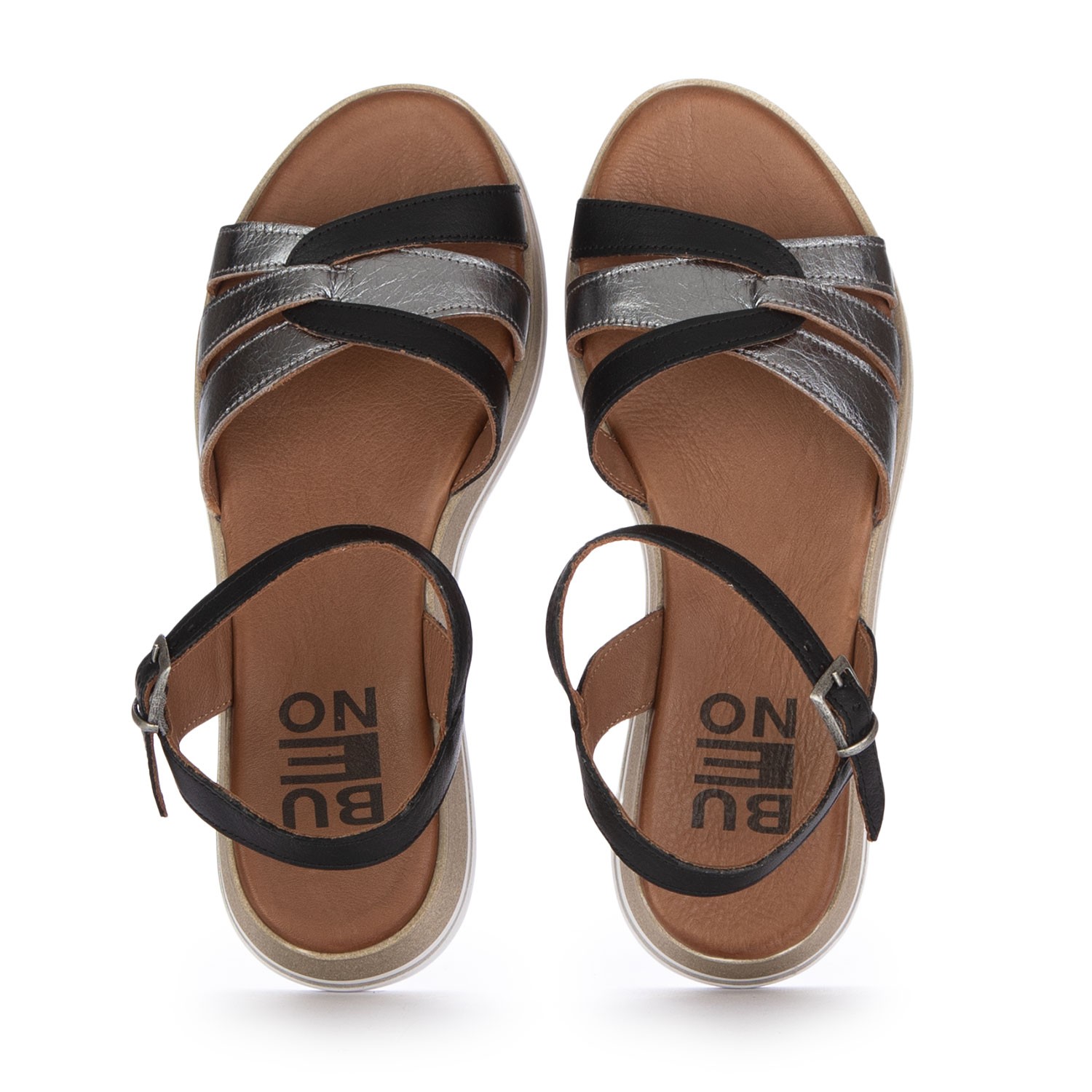 Sandali Bueno dal design moderno con platform e cinturino alla caviglia, caratterizzati da fasce incrociate in pelle liscia e metallizzata. La lavorazione accurata esalta il contrasto cromatico e garantisce comfort e stile per l’estate.