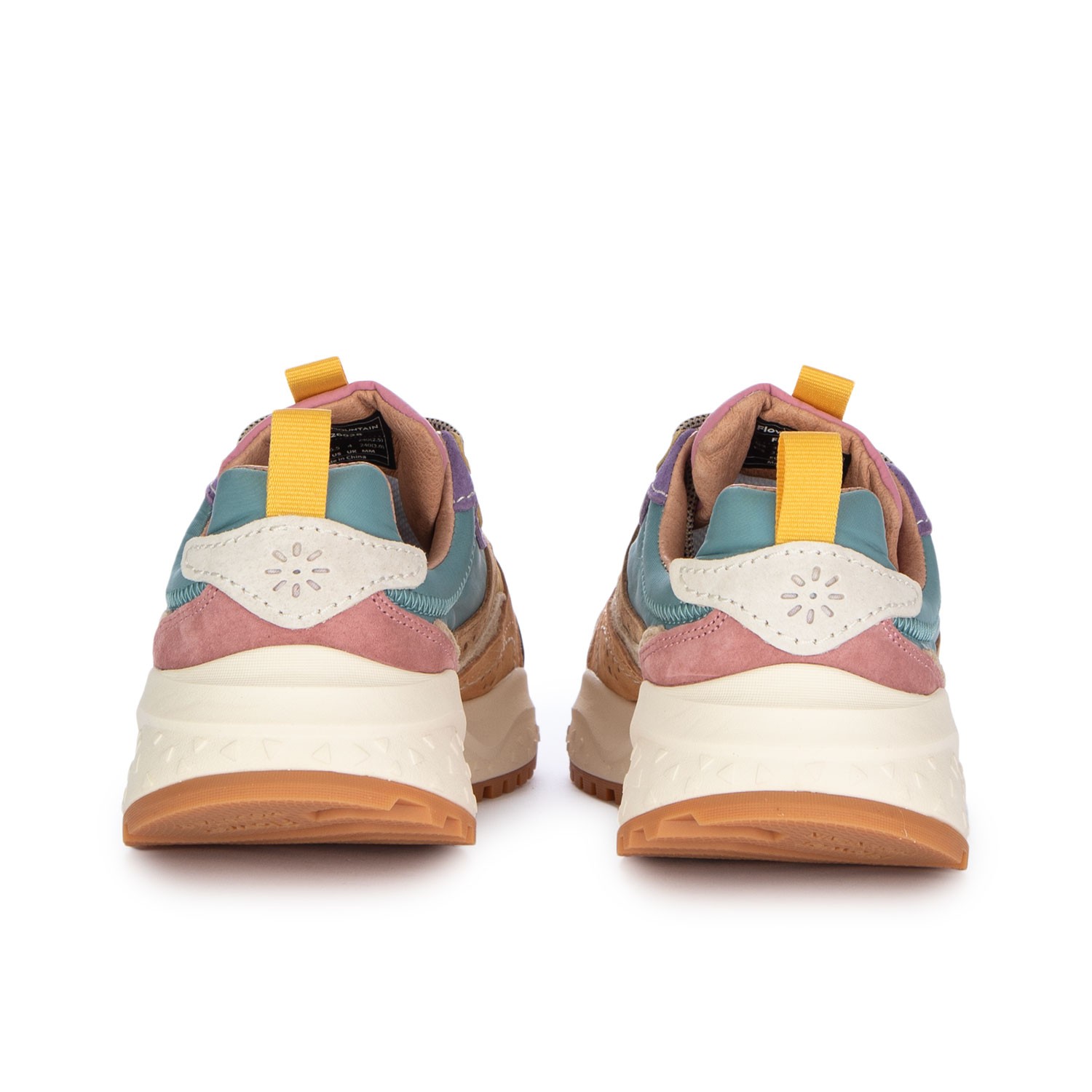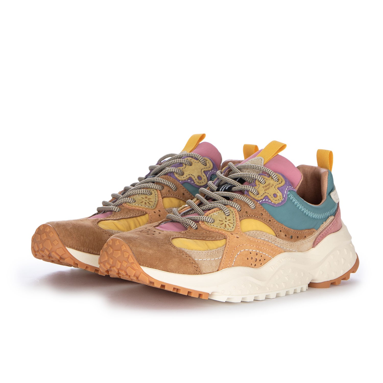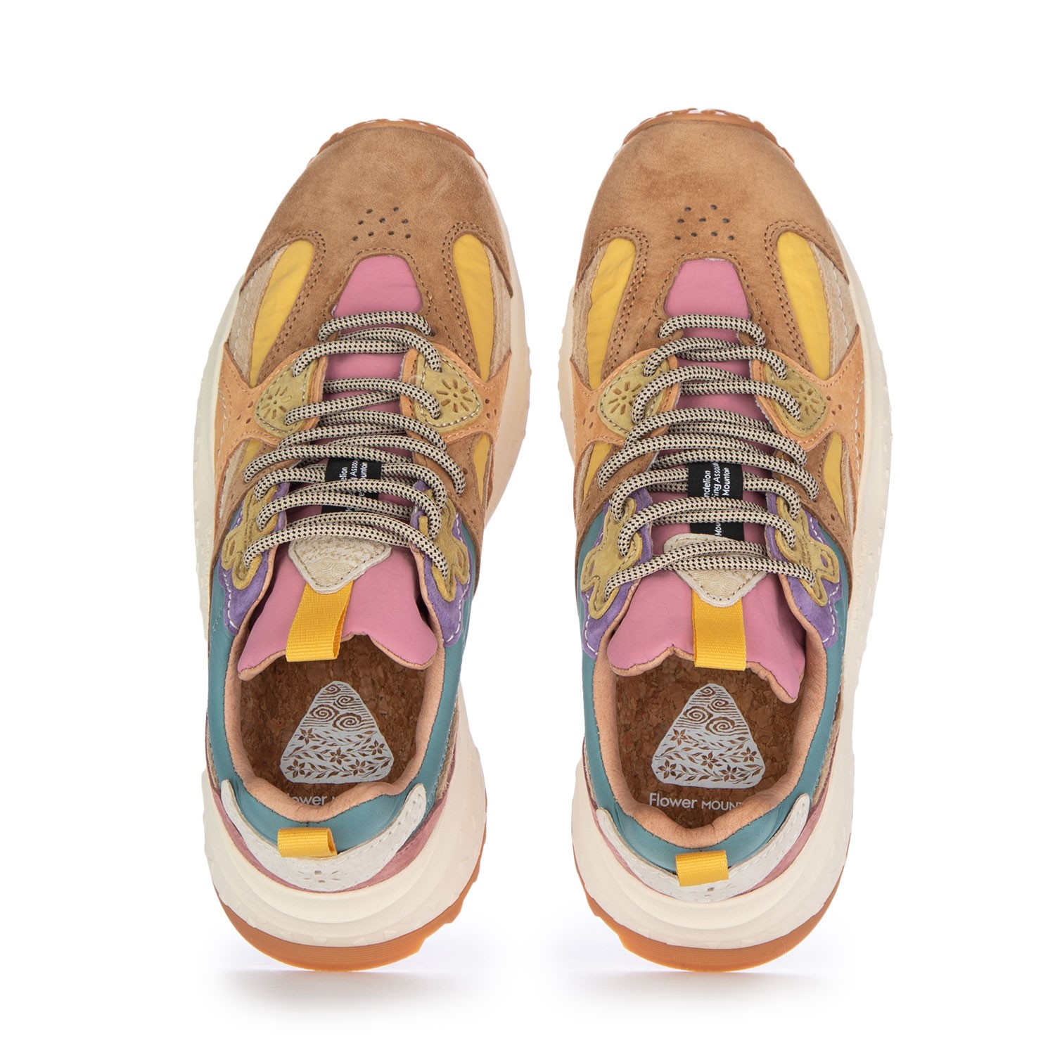 Sneakers Flower Mountain dal design outdoor e urbano, stile contemporaneo e versatile, con dettagli tecnici e occhielli a fiore. Tomaia in suede e tessuto tecnico, soletta in sughero e suola dentellata. Realizzate con cura e materiali di qualità.
