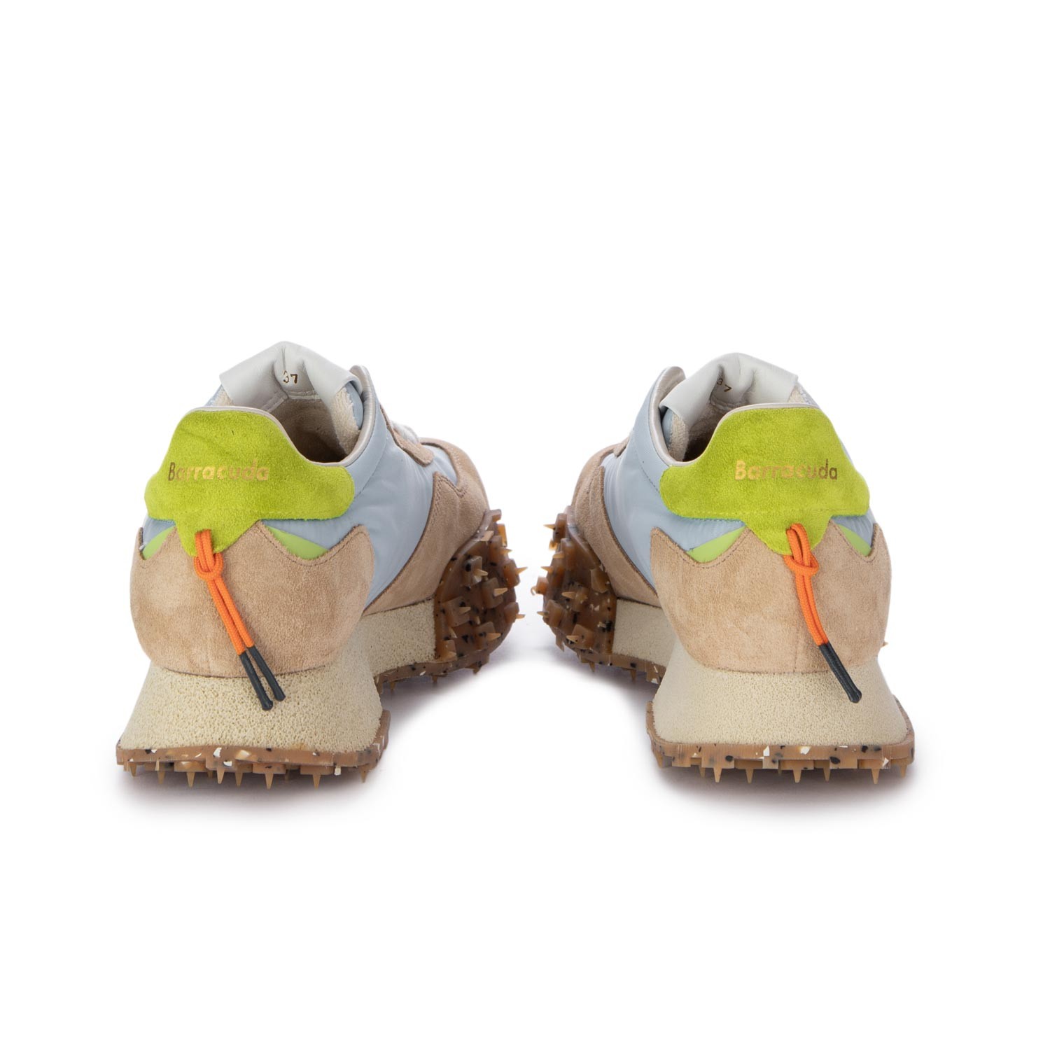 Sneakers Barracuda in stile vintage. Tomaia in pelle scamosciata marrone e nylon azzurro, con grande logo su un lato. Suola in gomma platform, con sotto delle applicazioni appuntite per un maggior comfort. L'interno è in pelle misto spugna di cotone e la soletta è in pelle. Fatte a mano in Italia.