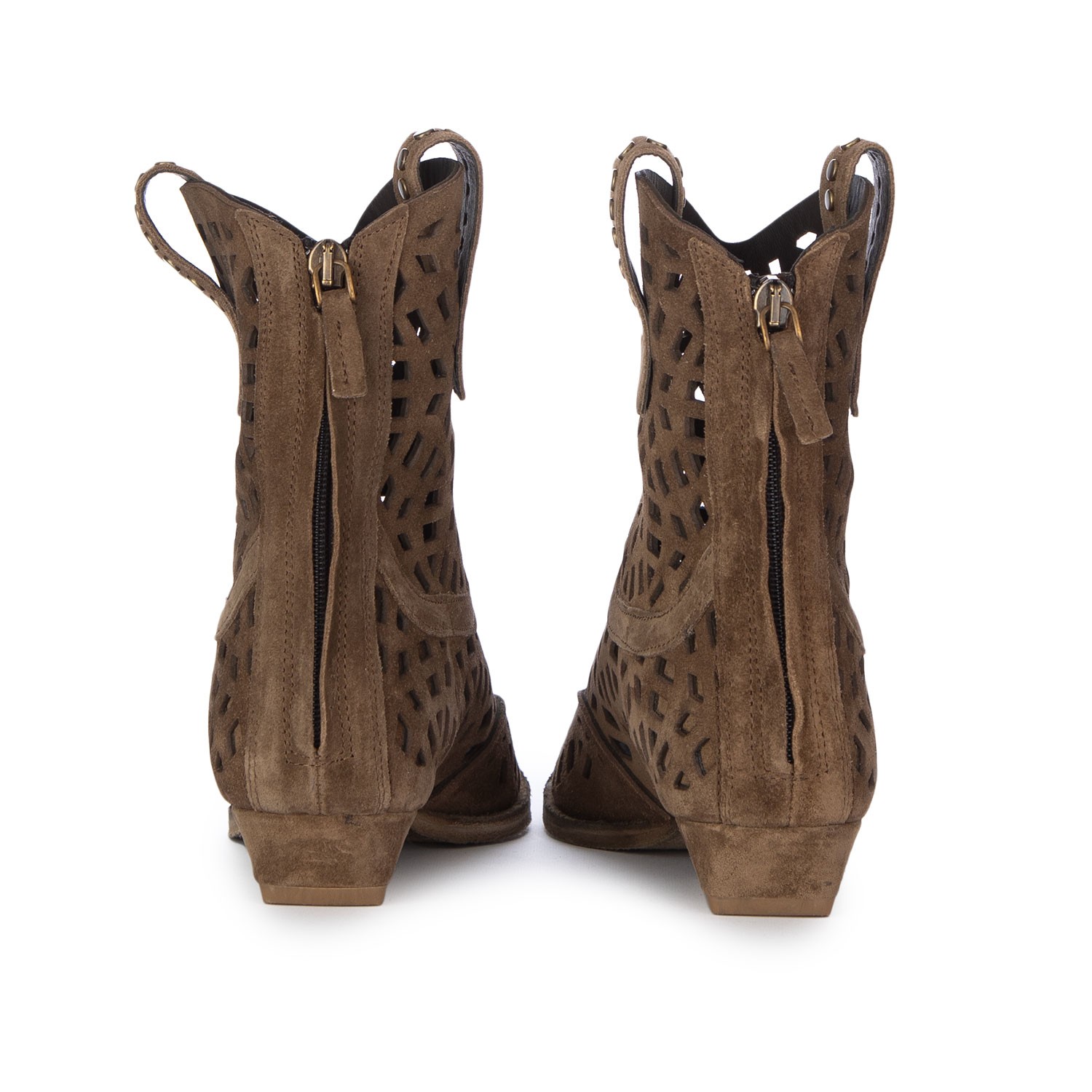 Stivaletti Mimmù dallo stile boho contemporaneo, caratterizzati da lavorazione traforata, zip posteriore e dettagli con borchie. Realizzati in pelle scamosciata, leggeri e traspiranti. Lavorazione artigianale curata, fatti a mano in Italia.